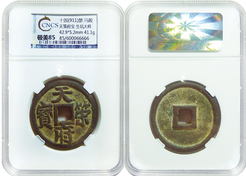 特征:正面環讀“天策符寶”,背穿上有“天”,面背有內外郭。徑4.3厘米,重36.6克。